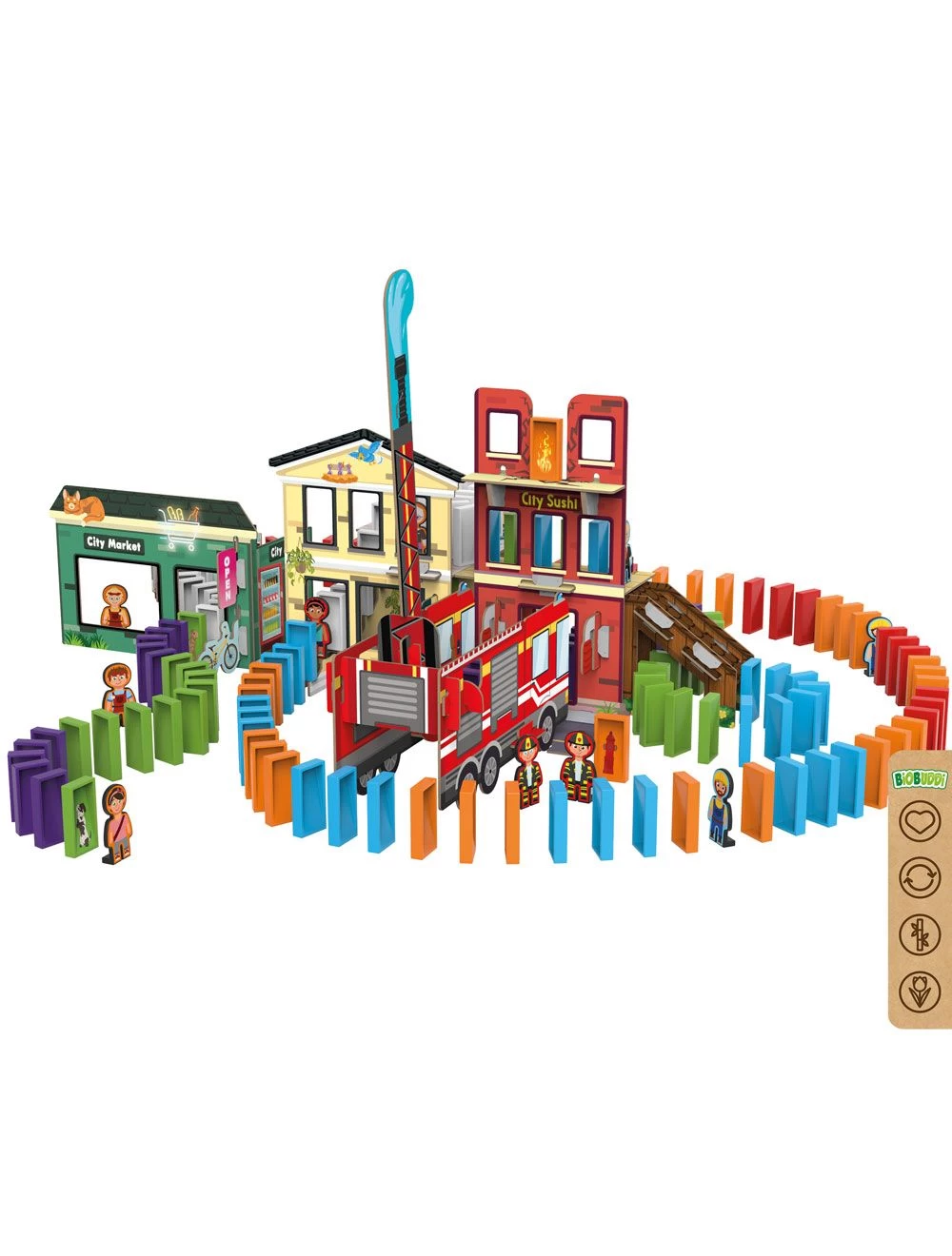 Dieses Set ist das „Domino Stadt“-Set. Kinder bauen zuerst eine große Stadt aus Karton, dann beginnen sie mit dem Platzieren der Dominosteine.