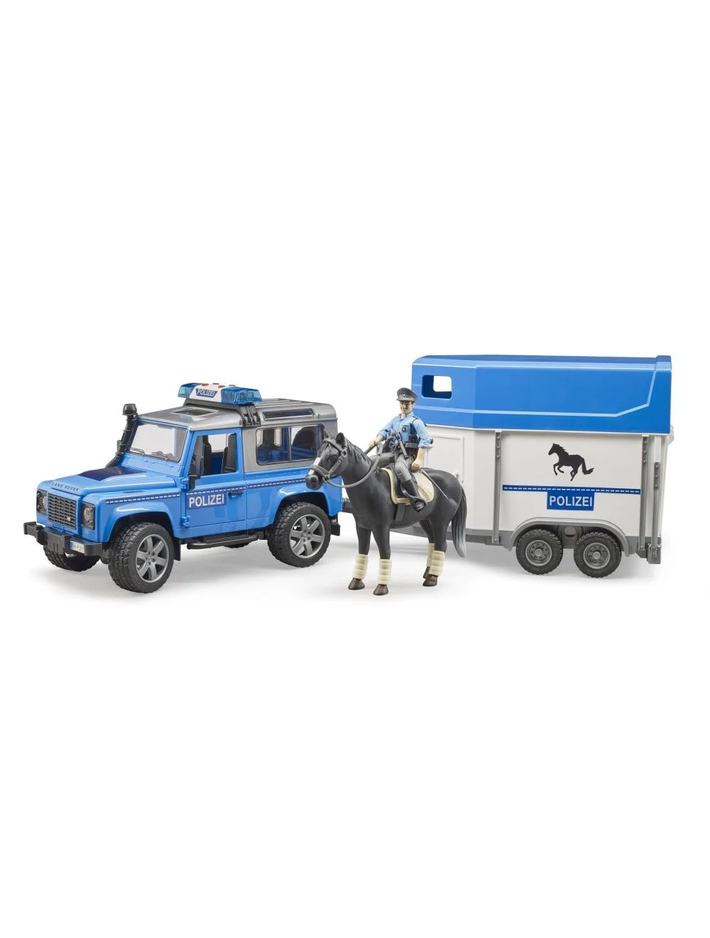 | Produktbeschreibung | Bruder Politie Landrover Defender Paardentrailer met politieagent te paard. De deuren van de auto kunnen worden geopend, waardoor er speelfiguren in plaats kunnen nemen. Via de achterklep van de paardentrailer kan het paard er in en uit worden gehaald. |