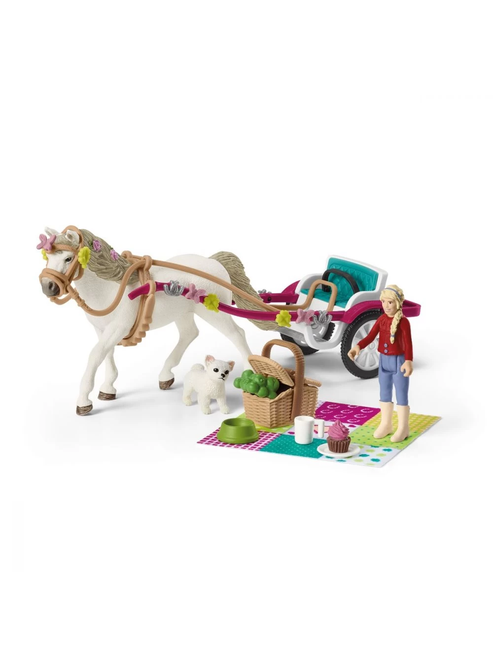 | Inhalt | 1x Mädchen, 1x Connemara Pony, 1x Chihuahua Welpe, 1x Kutsche mit Gurt, 1x Korb, 1x Teller, 1x Tasse, 1x Decke, 1x Cupcake, 1x Äfpel, 1x Napf, 1x Bauchgurt, 1x Zaumzeug, 1x Zügel, 6x Schmuck Hufeisen, 6x Schmuck Kleeblatt, 6x Schmuck Schmetterling, 1x Aufbauanleitung |